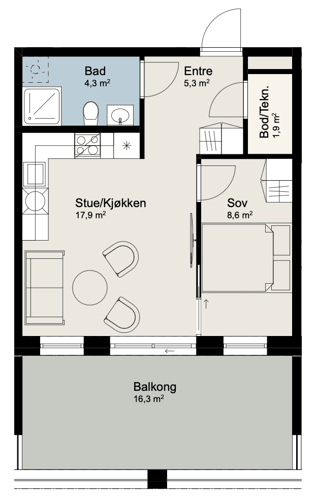 Flott entré, flislagt bad med dusj og plass til vask/tørk, bod for oppbevaring og et lekkert soverom med to innganger. I kjøkken og stue er arealet fornuftig utnyttet, og du har rikelig med plass til både spisegruppe og loungemøbler på balkongen.