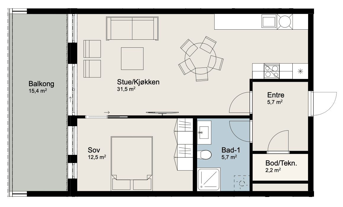 Klarer du deg med ett soverom, er denne leiligheten midt i blinken. Her er alt du trenger; entré med inngang til bod, flislagt bad med dusj, samt en flott stue. Kjøkkenet er praktisk plassert i egen nisje og gir rom til en hyggelig spiseplass. Utelivet nyter du på en 15 kvm. stor, vestvendt balkong.