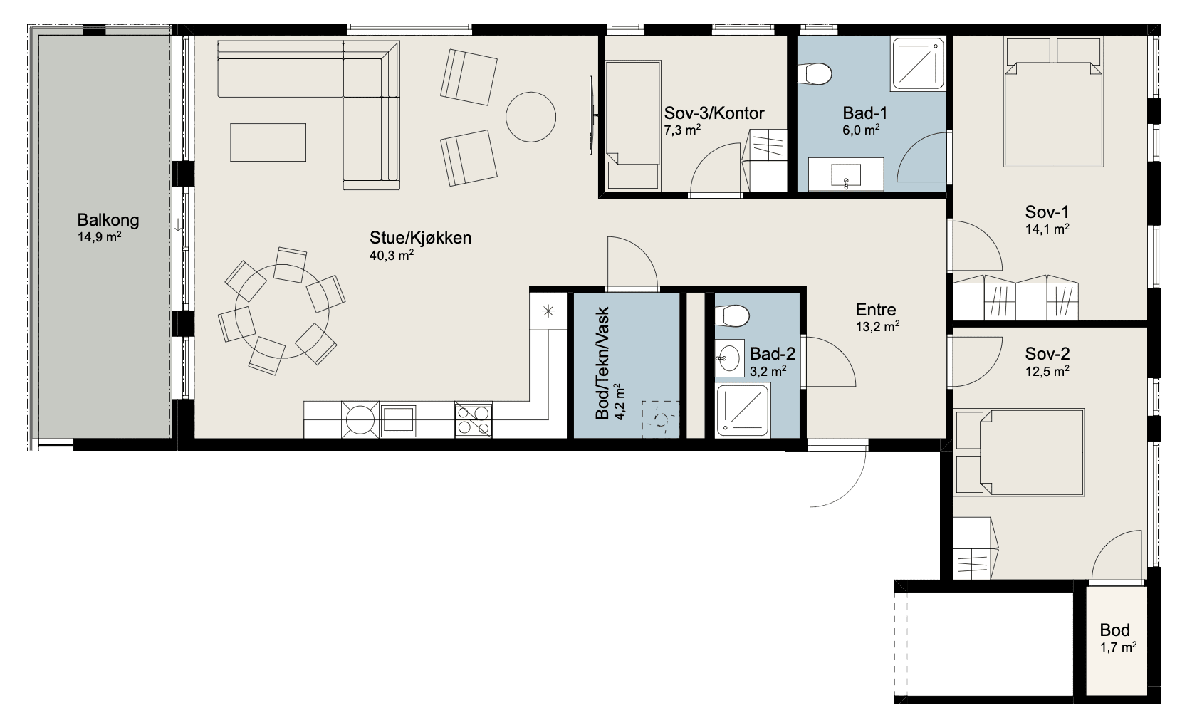 Her er tre romslige soverom og god plass til eventuelle overnattingsgjester. Hovedsoverommet har eget bad. Stor entré, bod, ekstra bad med dusj og eget vaskerom følger med. Stue/kjøkken er på hele 40 kvm. og du kan nyte vakker utsikt til sjø og båtliv fra balkongen.