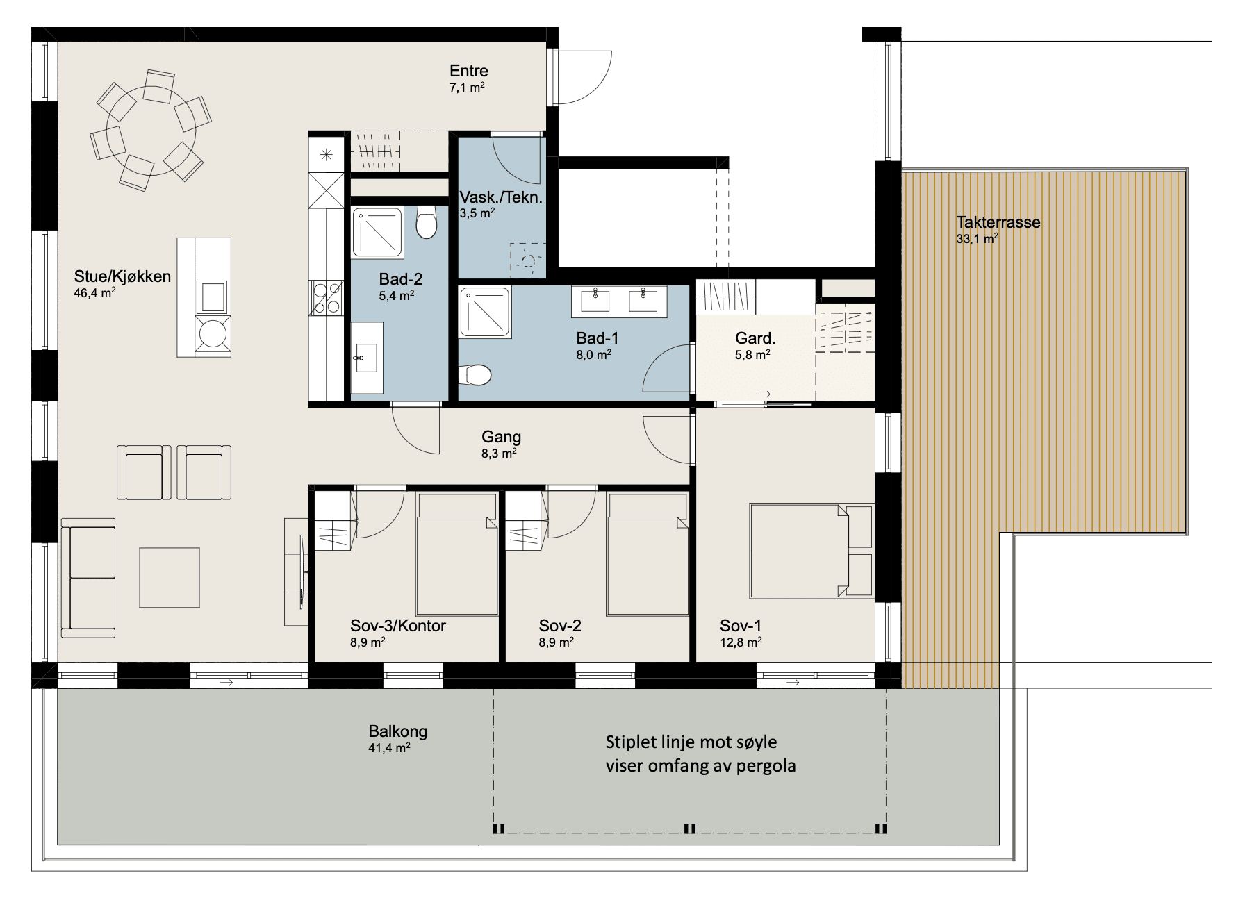 Fantastisk utsikt mot sjø, båthavn og strand samt en uteplass på hele 75 kvm. Boligen er videre utstyrt med to deilige bad, vaskerom, en fin entré og tre soverom – master bedroom med stor garderobe. Lekkert kjøkken med øy og en stue som inviterer til gode opplevelser.