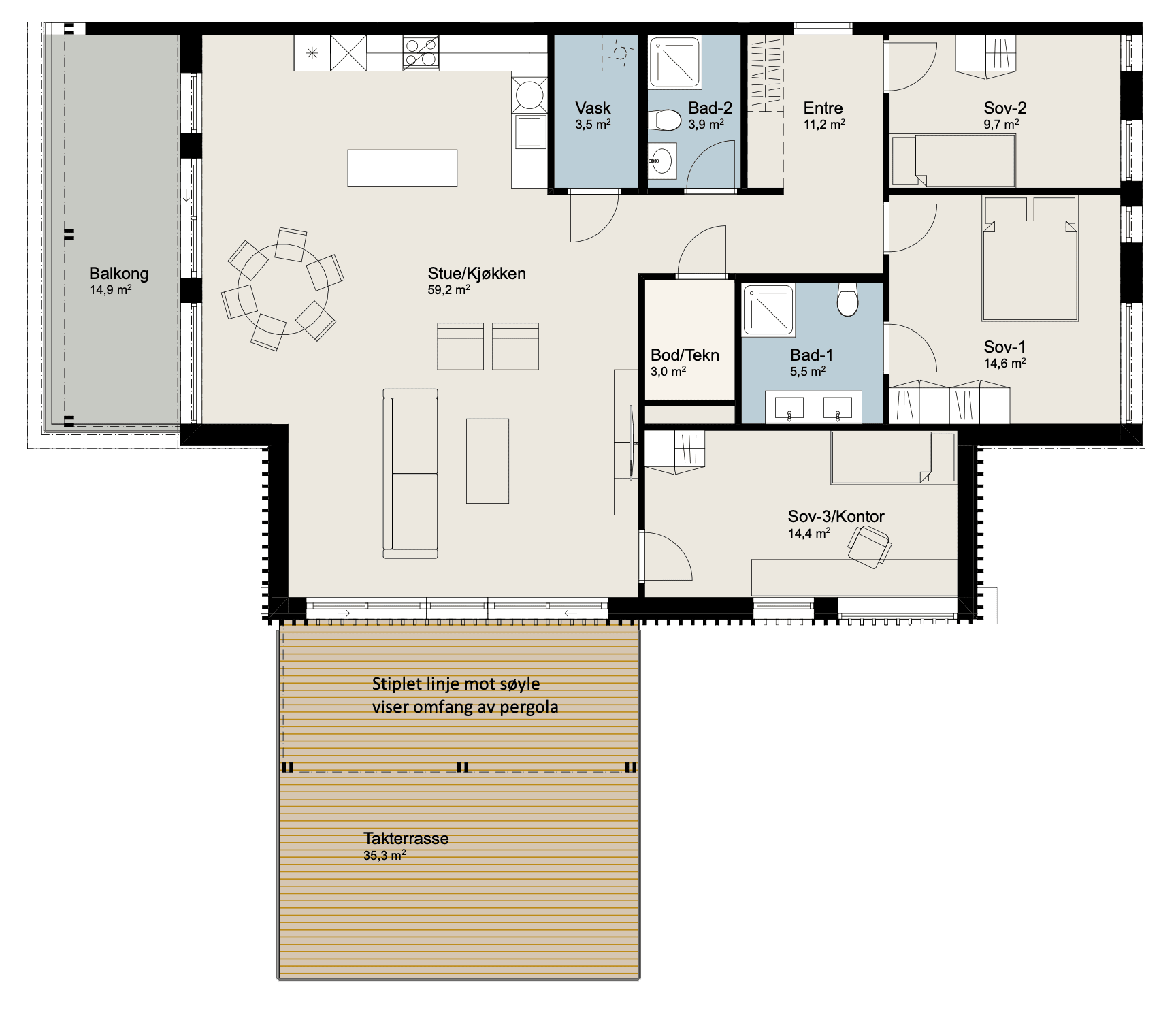 Her får du to store uteplasser og en mektig utsikt mot den blå horisonten i syd. Tre flotte soverom, to komplette bad, bod og eget vaskerom. Stuen er på nesten 60 kvm. og rommer TV-stue, spiseplass og et stort, lekkert kjøkken. Lange, varme sommerdager nyter du i solen eller under pergolaen.