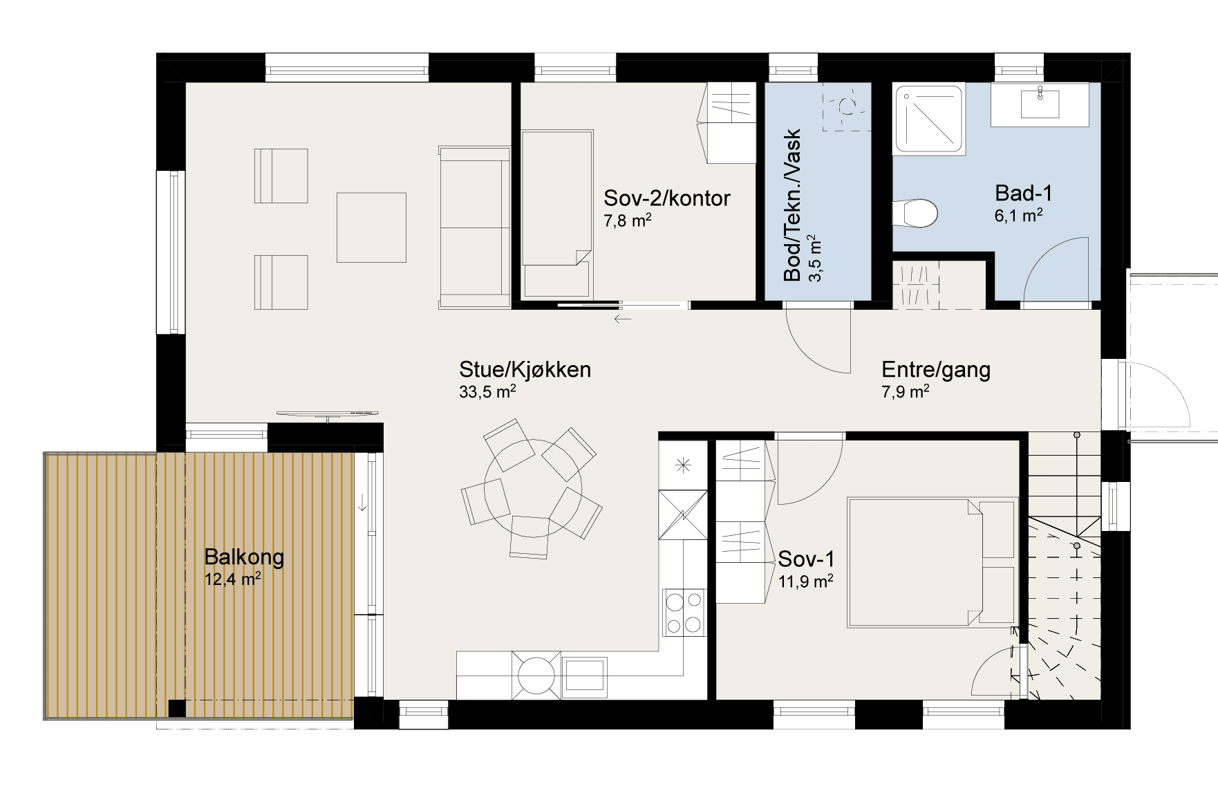 Her får du to flotte soverom, entré, et romslig bad samt vaskerom/bod. Trapp opp til hems på 10 kvm. i tillegg til ekstra lagringsplass i bod. Kjøkken og stue har hver sin naturlige plass i rommet, og balkongen byr på vakker sydvendt utsikt mot fjorden.
