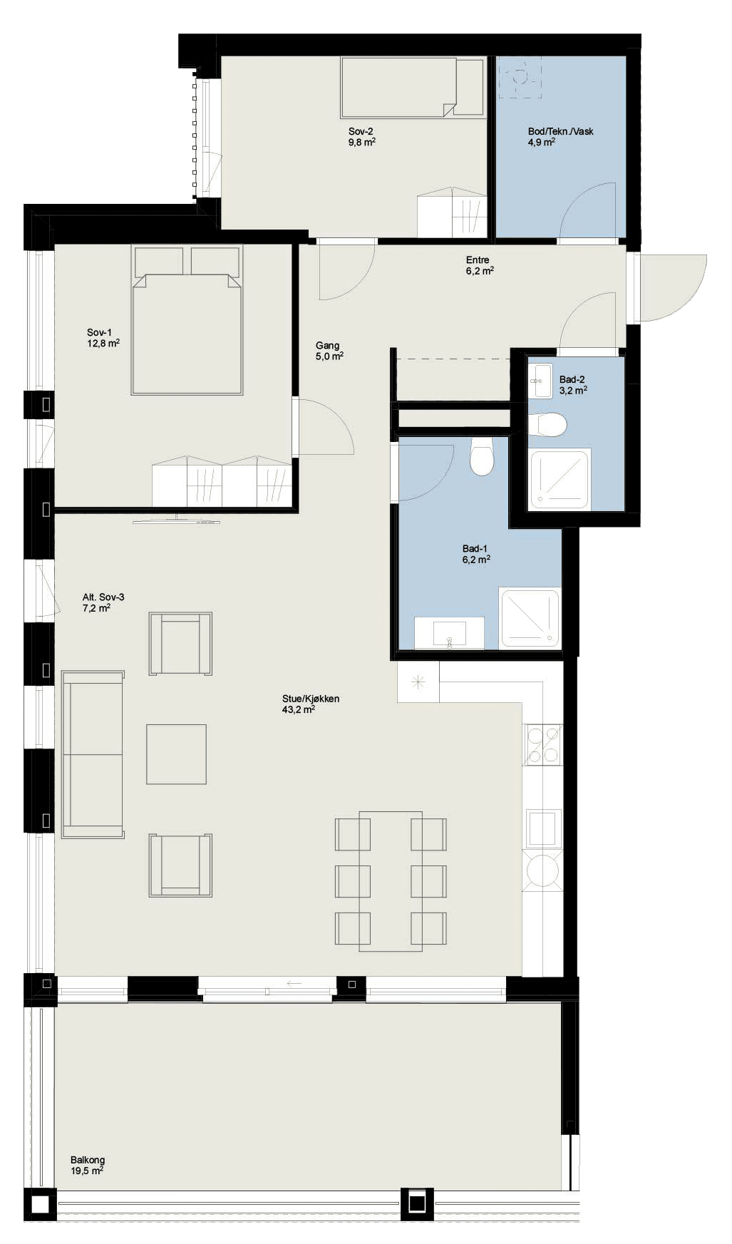To eller tre soverom, to komplette bad med dusj, eget vaskerom/bod samt en stor entré. I den luftige stuen er det generøst med vindusflater og på kjøkkenet er det plass nok til å invitere hele storfamilien på søndagsmiddag. Stor og fin balkong med åpning mot syd og vest.
