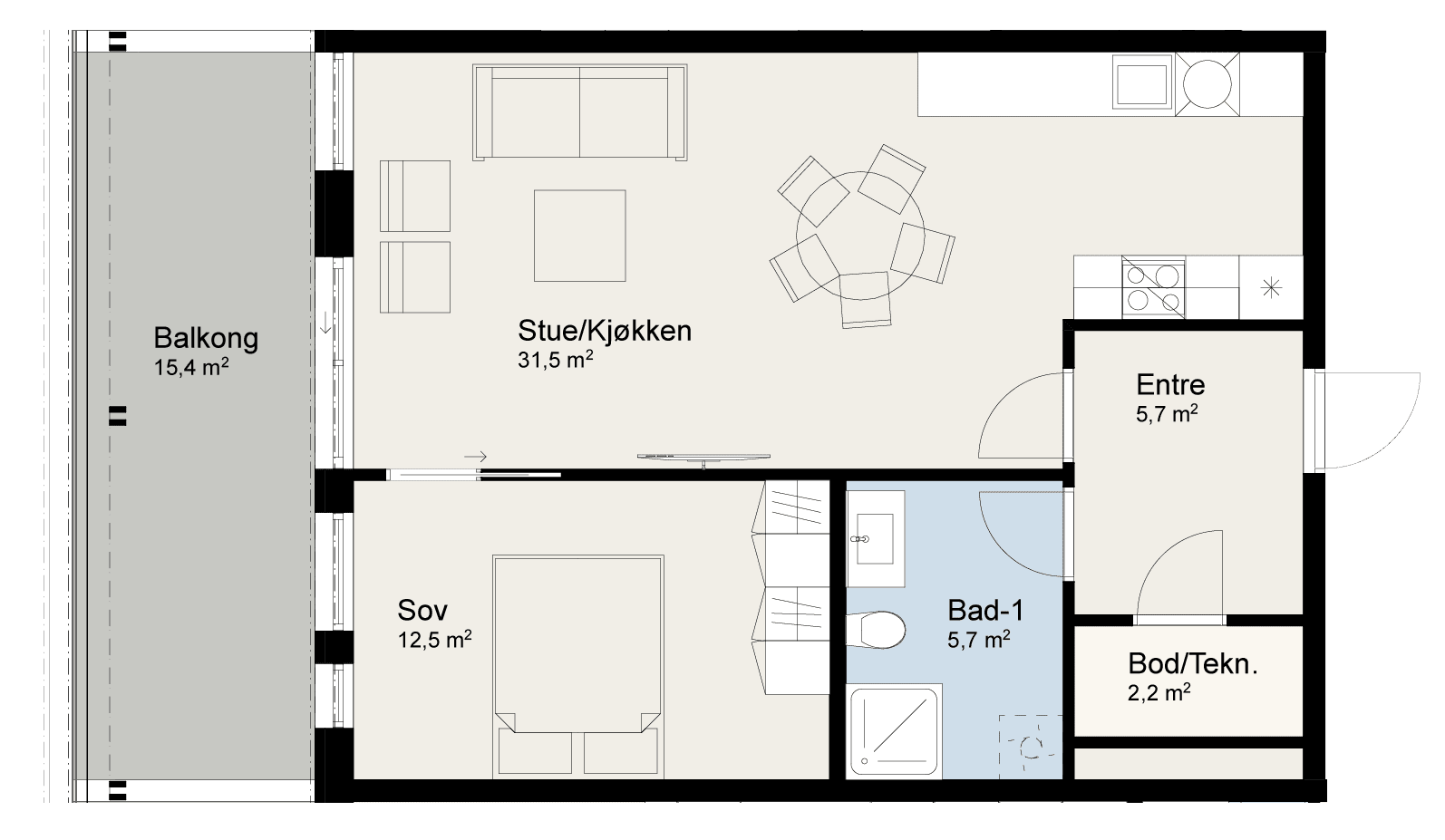 Perfekt løsning for de som klarer seg med ett soverom. Entré med inngang til bod, flislagt bad med dusj, samt en flott stue. Kjøkkenet er praktisk plassert i egen nisje og gir rom til en hyggelig spiseplass. Utelivet nyter du på en 15 kvm. stor, vestvendt balkong.
