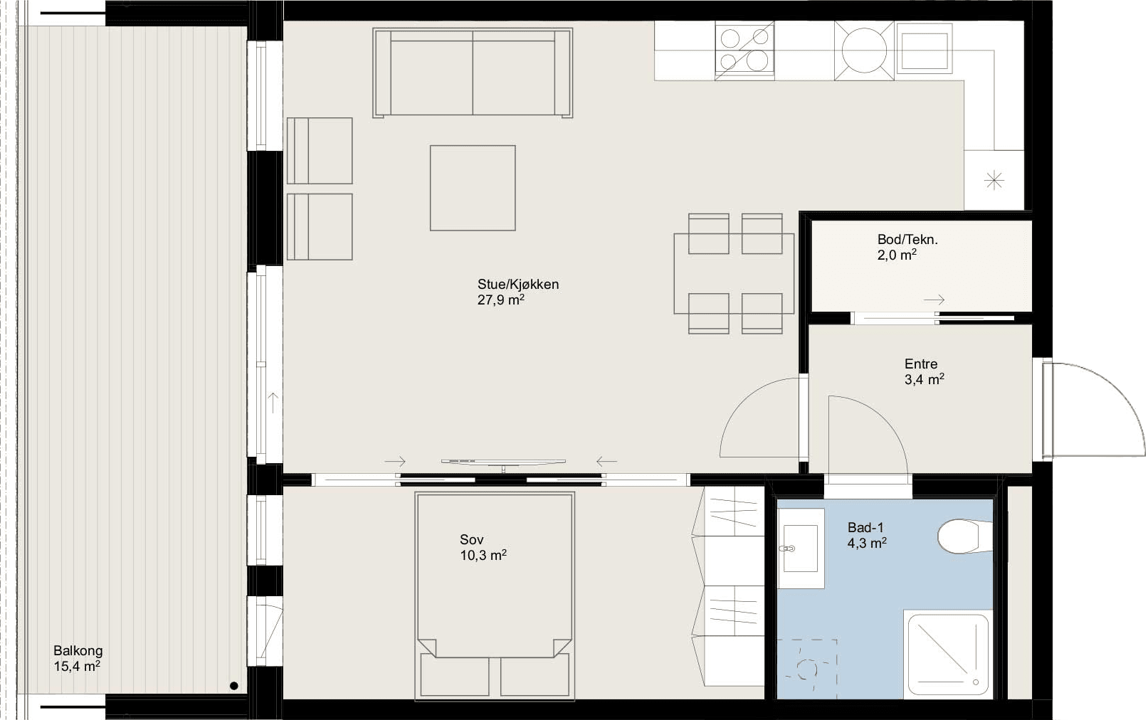 Entré, bod og bad med opplegg for vaskemaskin. Soveromsløsning