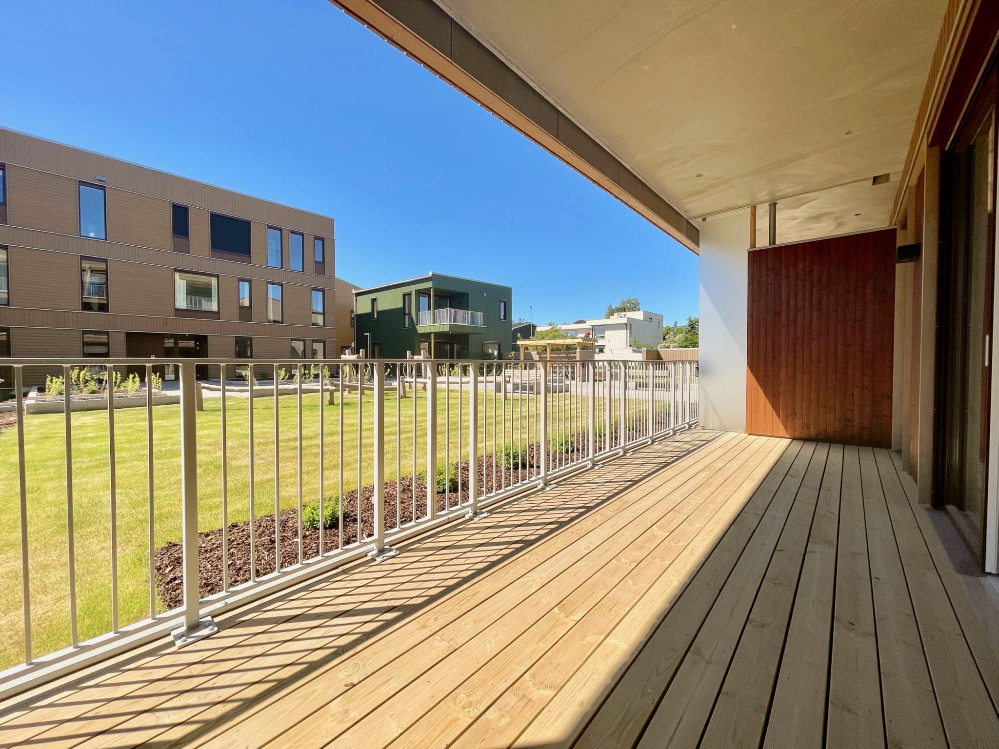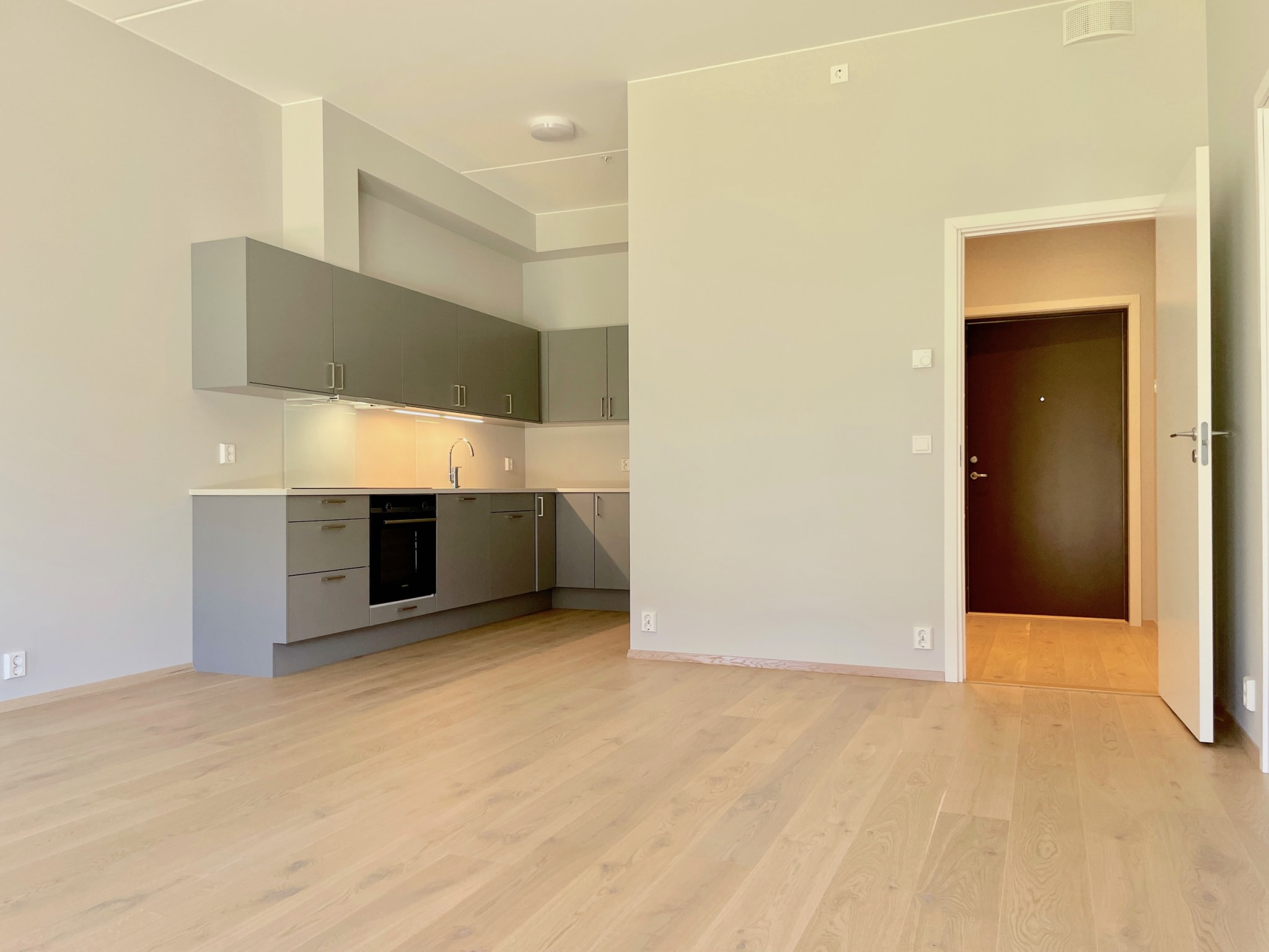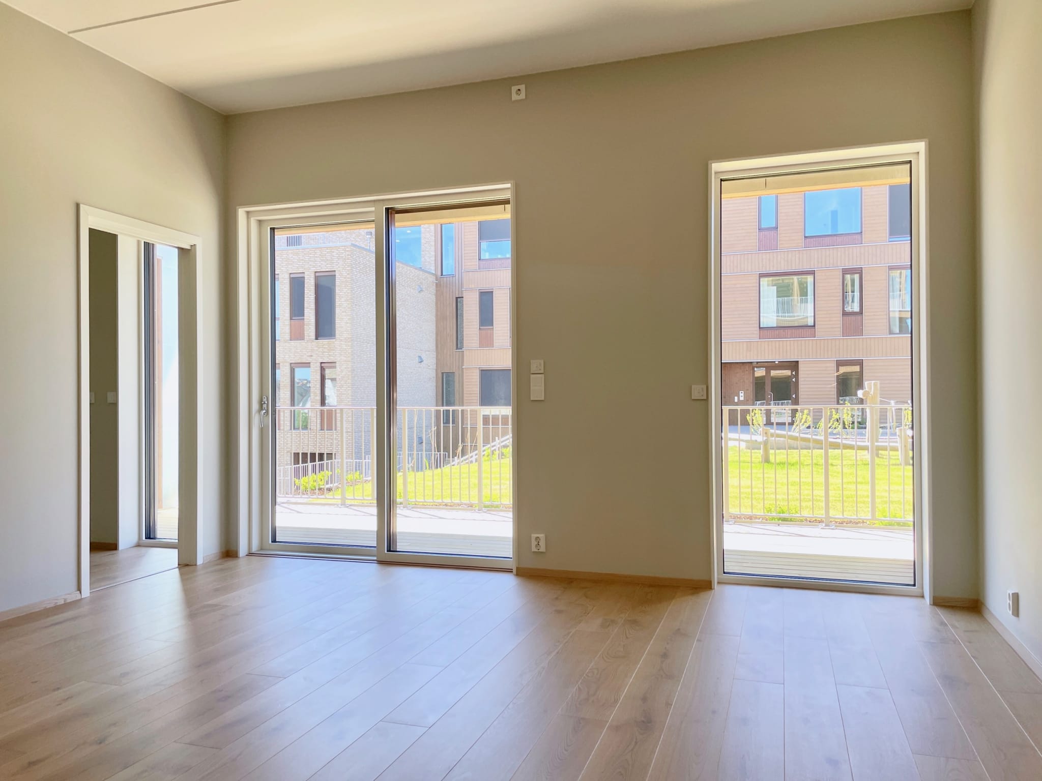 med to skyvedører som tilfører ekstra areal i stuen. Hyggelig kjøkken og utgang til vestvendt balkong.