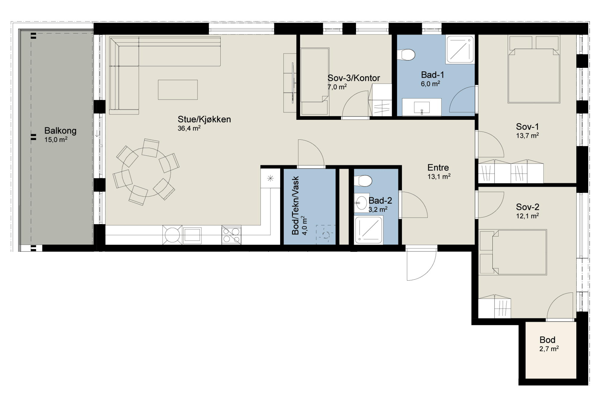 Denne flotte leiligheten ligger i fjerde etasje og har to store soverom, samt et rom for kontor/gjesterom. I tillegg har den to bad, bod, stor entré og vaskerom. Du få rikelig med skapplass på kjøkkenet og har god plass til både spisestue og sofa. Utgang til vestvendt balkong.